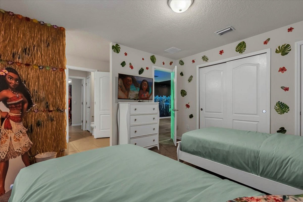 LOOKING for a vacation home that is new and lots of fun? This is it! It has a Star Wars themed movie theater inside, a poolside theater, a poolside bar and TV, a Star Wars theme game room, 3 themed kids' bedrooms, Mickey's Campsite (under the stairs), and a private south facing heated pool and spa (heating extra $). It's a very easy drive or walk to the Windsor At Westside clubhouse and water park. The large clubhouse has an exercise room, restaurant, bar and arcade. The water park has a large zero entry pool, a kids splash pool, and a lazy river. There is also a volleyball court and tennis/pickle ball/basketball court. And, it's within 15-40 minutes from Disney World, SeaWorld, Universal Studios, great restaurants and shopping, and the Orlando International Airport.