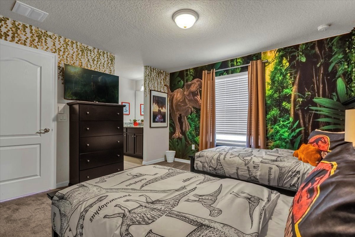 Bedrooms: 8 Total. 1st FLOOR: Master Suite w/ King; 2nd Suite w/ King. 2nd FLOOR: 3rd & 4th Suites w/ Kings; 1 Bedroom w/ King; 2 Themed (Jurassic Park and Moana) Bedrooms w/ Twins; 1 Themed Bedroom (Avengers) w/ Bunk Bed (double and twin) - SLEEPS 16 MAX.