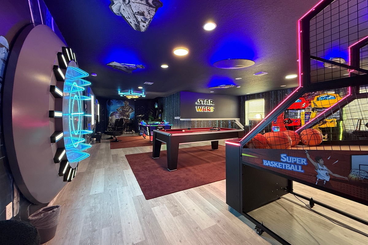 In-Home Entertainment: Star Wars Themed Arcade Game Room (Arcade Games: Aliens Extermination, Outrun Car Racing, Air Hockey, and Street Basketball - All of these arcade games are FREE-TO-PLAY!) - Pool Table - Xbox Console With Screen - Star Wars Themed Movie Theater (155" Screen And Surround Sound) - Living Room With 75" Flat Screen Smart TV - Smart Flat Screen TVs In Every Bedroom - FREE WiFi